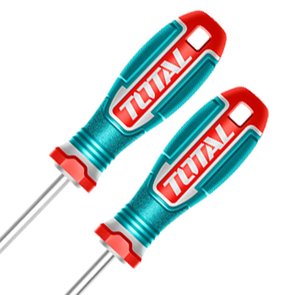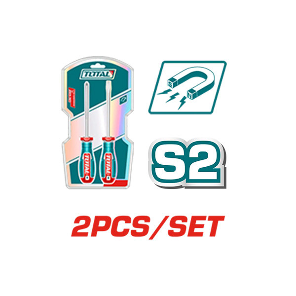ست دو عددی پیچ گوشتی دوسو چهارسو برند توتال، ساخته شده از آلیاژ S226 فولاد حرارت دیده مقاوم، دارای نوک آهنربایی و دسته فایبرگلاس ضد لغزش سبک، محکم و خوشدست