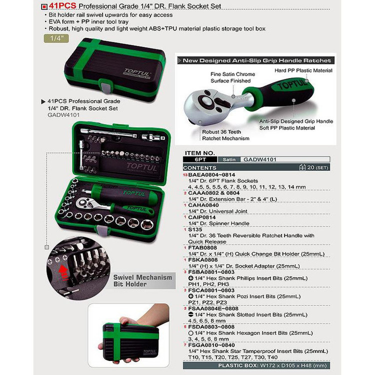 محصولات تاپ تول تولید کشور تایوان میباشند و از بهترین متریال تهیه و تولید شده اند، جعبه بکس های تاپتول از معروفترین و پرمصرفترین جعبه بکس های بازار ابزار ایران و جهان میباشند. این محصول تاپتول در واقع یک جعبه بکس 1/4 است که علاوه بر بکس های درایو 1/4 شامل بیت های کوتاه ستاره ای، آلنی و دوسو و چهارسو و نیز رابط های کوتاه و بلند میباشد که موجب شده یک محصول بسیار مناسب جهت مصارف ظریف همچون اسپیس و باتریسازی ها و ... باشد و همینطور مناسب کار در فضاهای کوچک است که ابزارهای بزرگتر قدرت مانور در آنها را ندارند.