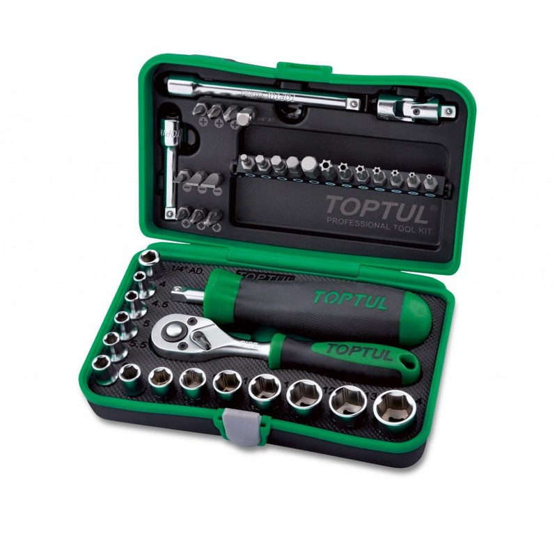 محصولات تاپ تول تولید کشور تایوان میباشند و از بهترین متریال تهیه و تولید شده اند، جعبه بکس های تاپتول از معروفترین و پرمصرفترین جعبه بکس های بازار ابزار ایران و جهان میباشند. این محصول تاپتول در واقع یک جعبه بکس 1/4 است که علاوه بر بکس های درایو 1/4 شامل بیت های کوتاه ستاره ای، آلنی و دوسو و چهارسو و نیز رابط های کوتاه و بلند میباشد که موجب شده یک محصول بسیار مناسب جهت مصارف ظریف همچون اسپیس و باتریسازی ها و ... باشد و همینطور مناسب کار در فضاهای کوچک است که ابزارهای بزرگتر قدرت مانور در آنها را ندارند.