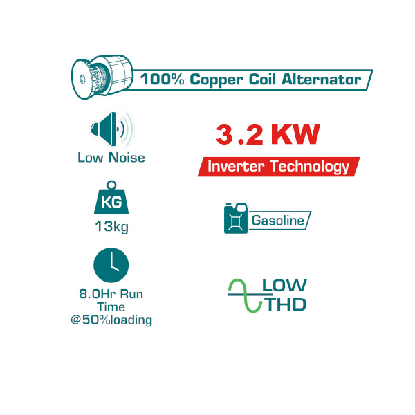 ساخته شده از درجه بندی 190 سیسی, دارای سنسور هشدار سطح روغن, مجهز به سیستم خنک کننده هوا خنک, بهینه شده با مصرف کم و بازدهی بالا, مجهز به سیستم استارت هندل و الکتریک, دارای قابلیت استارت آسان و مناسب برای روشن شدن در شرایط مختلف, مدت زمان کارکرد در ۵۰٪ بار: ۸.۵ ساعت, خروجی با موج سینوسی خالص: نوسان ±۳٪, سرعت خروجی: ۳۳۰۰ تا ۴۸۰۰ دور در دقیقه, ظرفیت روغن موتور: 0.55 لیتر, نوع روغن موتور: SAE 10W-30, قابلیت 8:30 ساعت کار کرد, مجهز به موتور 100 مسی, مجهز به موتور تک سیلندر، 4 زمانه،